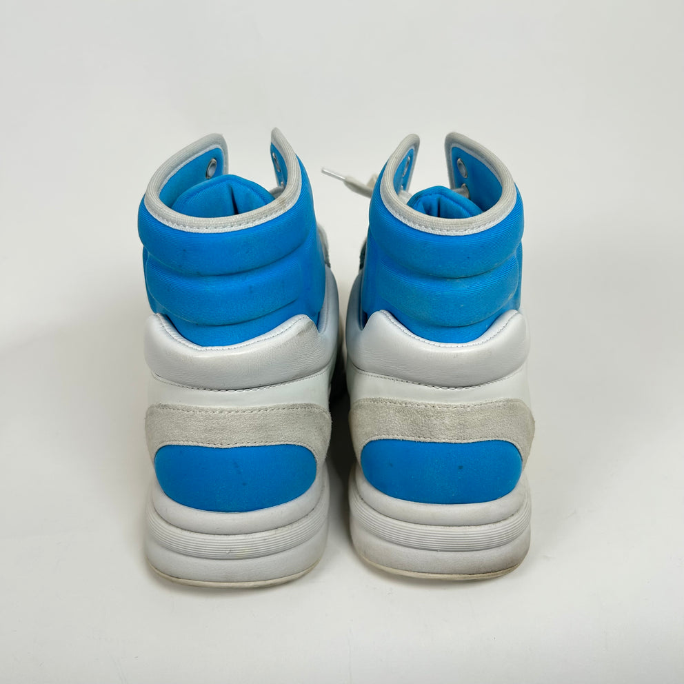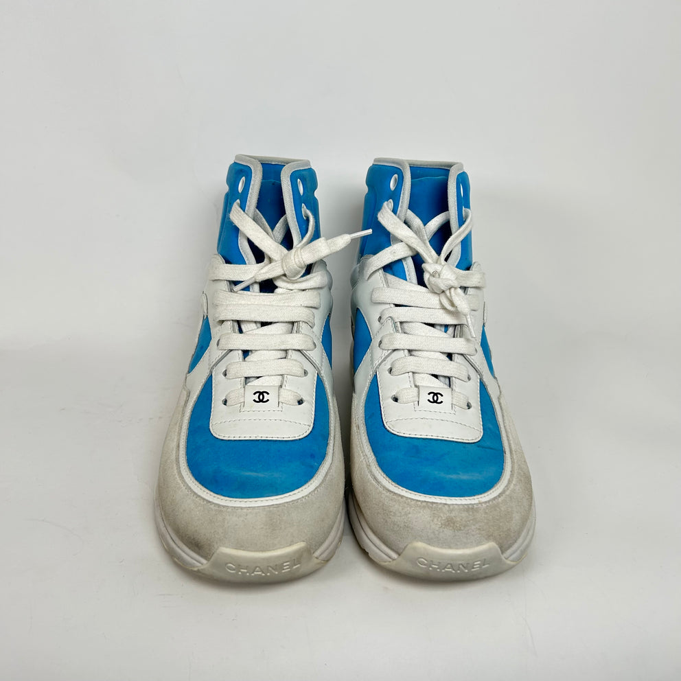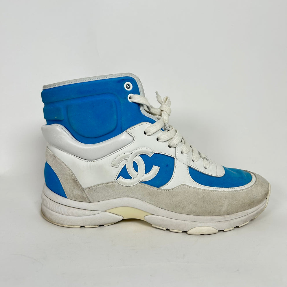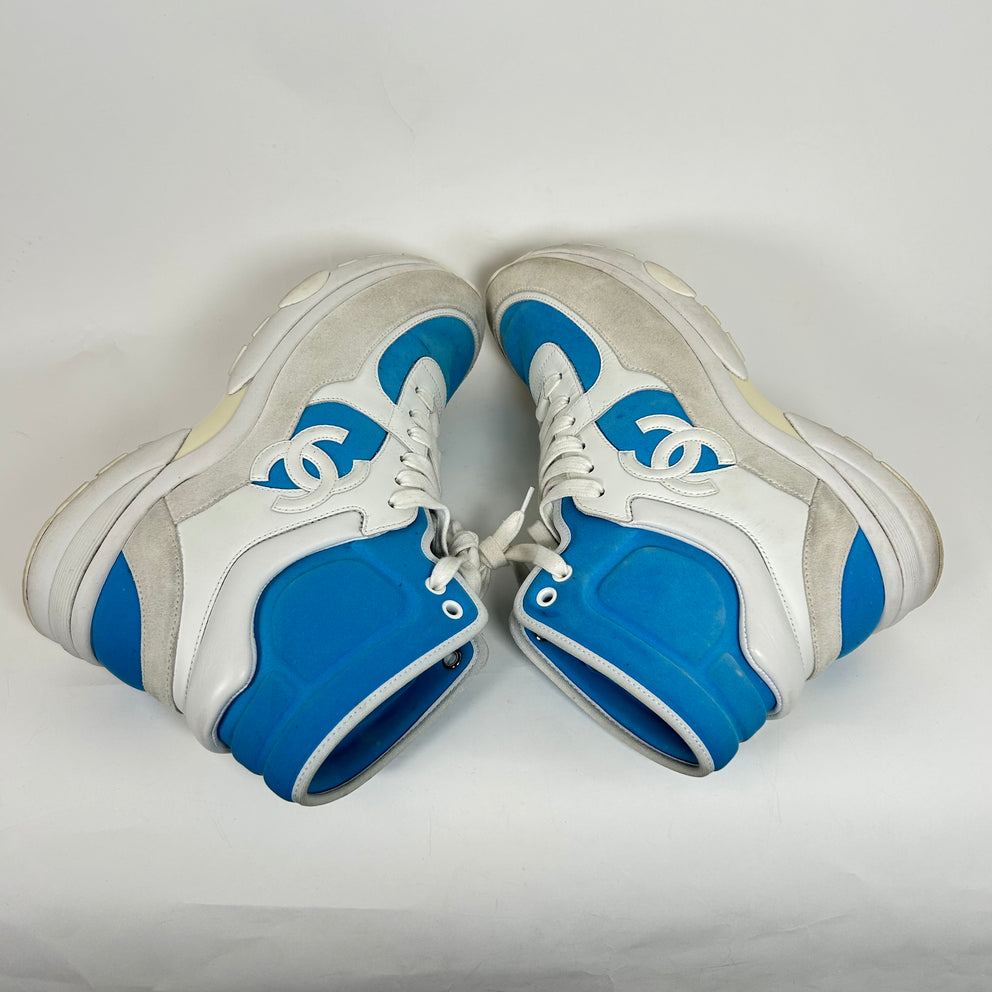 Chanel White/Blue Interlocking CC High-Top Sneaker Size 38.5