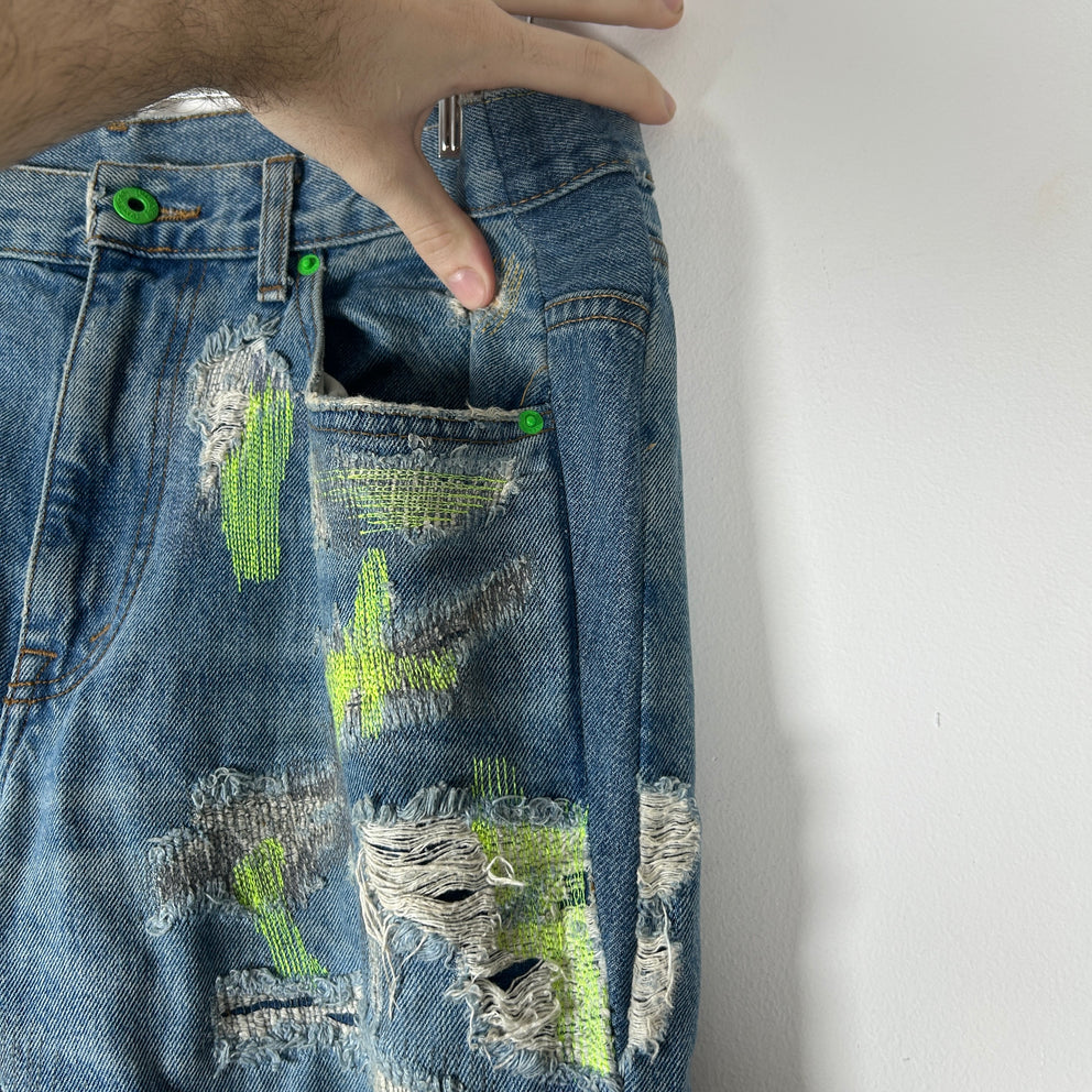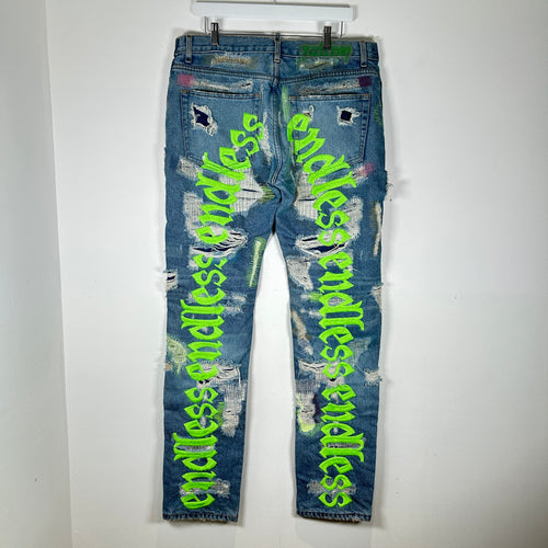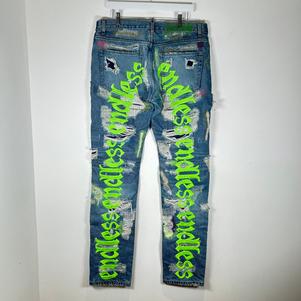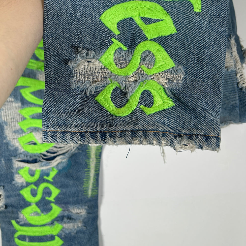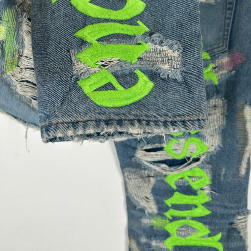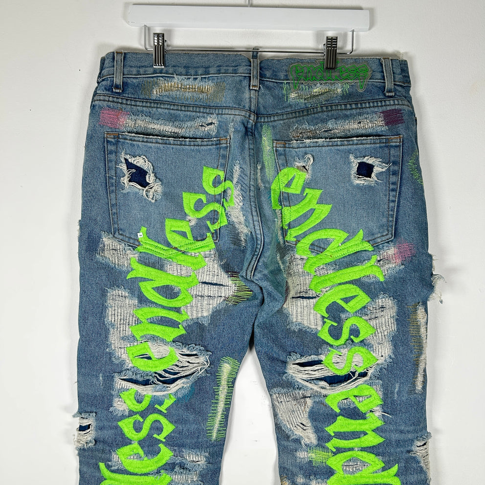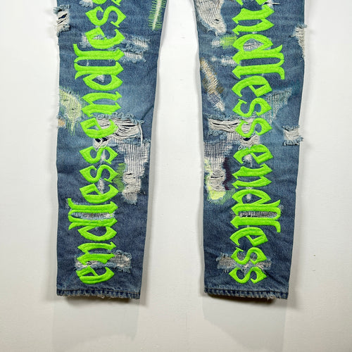 Endless Neon Green Embroidered Blue Denim Jeans Size 36